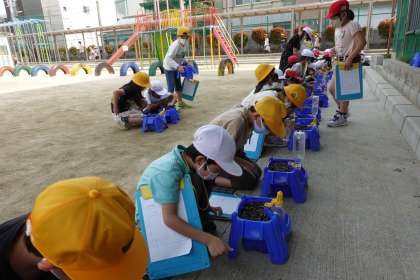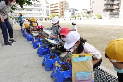 1年生の下校を見送っていたら、偶然3年2組が階段から降りてきました。芽が出始めたマリーゴールドを観察するそうです。2回目の撮影になってしまいました。