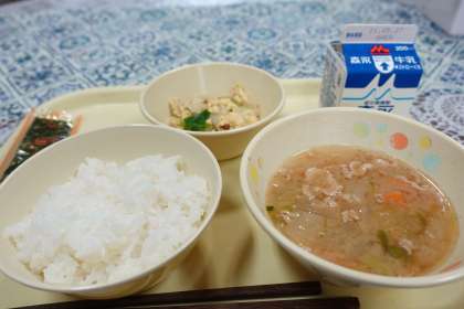 今日の献立は、きぬがさ丼、豚汁、海苔、牛乳です。