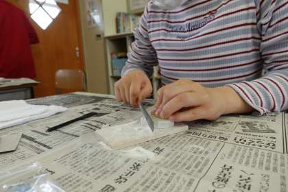 作業に入ります。勾玉の形に糸鋸で切り、形を整えます。