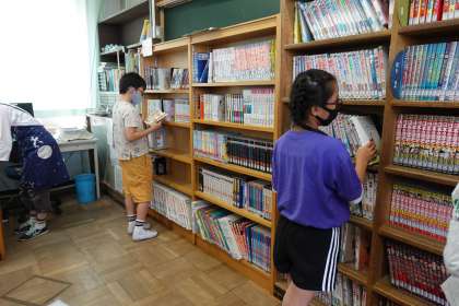 5年1組が図書室を使用していました。気に入った本を見つけられたでしょうか?