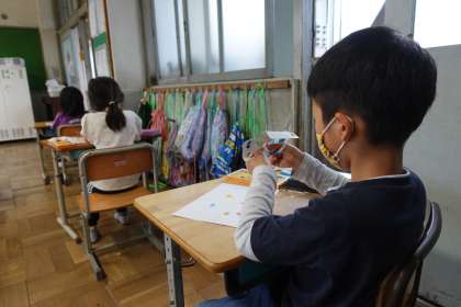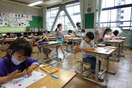 1年1組の様子です。ハサミの使い方を学習しています。