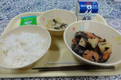 今日の献立は、いそ煮、おひたし、ご飯、牛乳です。