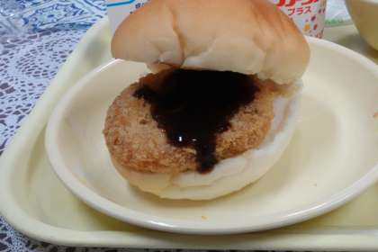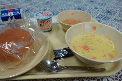 今日の献立は、バーガーパン、鮭ミンチカツ、コーンクリームスープ、ヨーグルト、牛乳です。