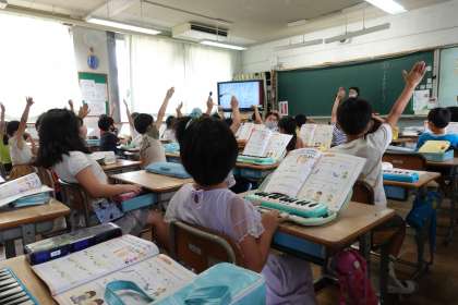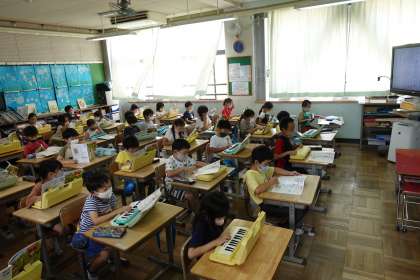 音楽の授業です。今は管楽器の演奏ができないので、「かっこう」の指使いを確認しました。