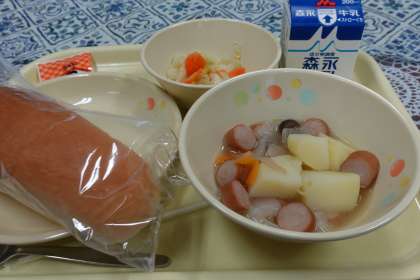 今日の献立は、ポトフ、洋風野菜炒め、コッペパン、ミルクバター、牛乳です。