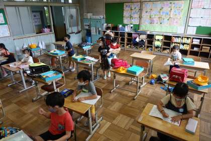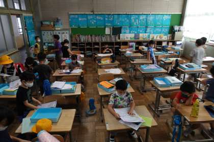 写真は朝の準備をする1年2組と2年1組です。(1年1組は更衣中でした)今日も頑張りましょう。