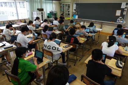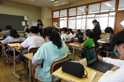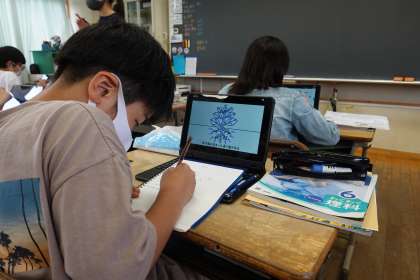 6年1組の理科です。タブレットを使い、学びを深めています。