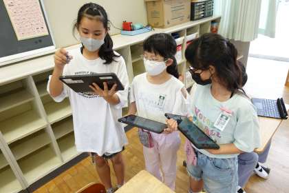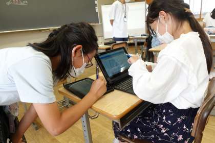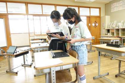 5年1組 その2です。タブレット使い、自分の考えを交流しています。