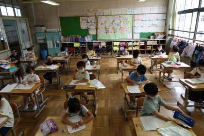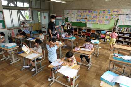 朝の準備をする1年生です。