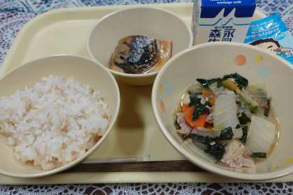 今日の献立は、寄せ鍋風、さばの煮つけ、玄米ご飯、ふりかけ、牛乳です。