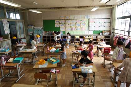 朝の準備をする1年2組です。(1組は更衣中でした。)