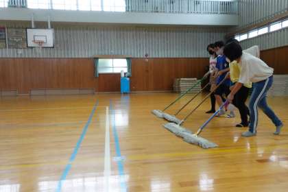 今日もごくろうさまです。体育館周りをそうじしてくれている6年生を撮影しました。