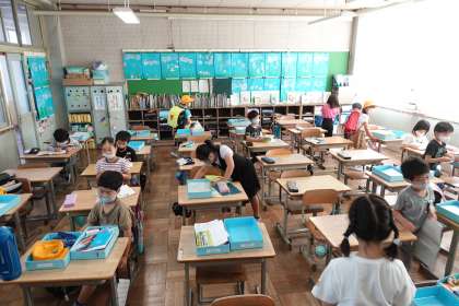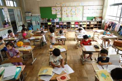 写真は朝の準備をする1年2組と2年1組です。(1年1組は更衣中でした)