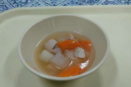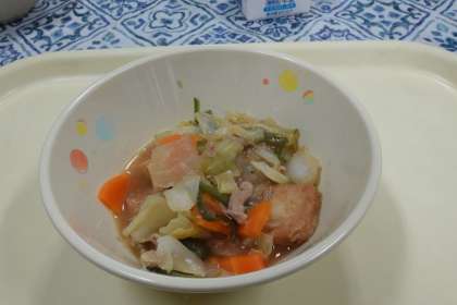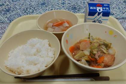 今日の献立は、厚揚げと豚肉の味噌煮、冬瓜のスープ、ご飯、牛乳です。味噌煮はご飯にとてもあう味でした。