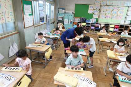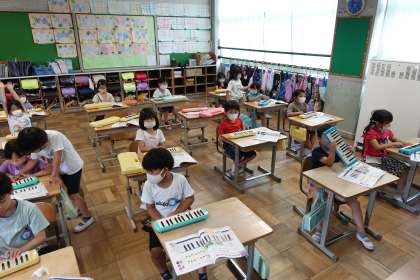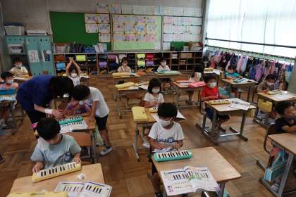 1年2組です。久しぶりに校長先生もキーボードを弾かせてもらいました。