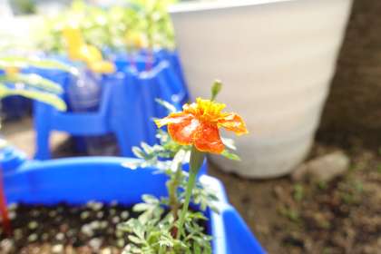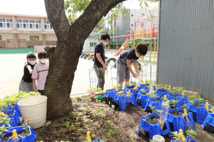 写真はホウセンカとマリーゴールドに水やりをする3年生です。マリーゴールドがあちこち咲き始めました。