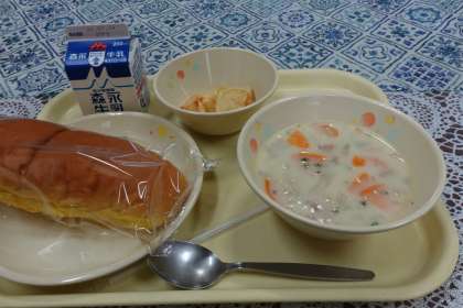 今日の献立は、シーフードスープスパ、フライドポテト、パンプキンパン、牛乳です。ホワイトルウで仕上げられたシーフードスープスパは滑らかでマイルドな味わいでおいしかったです。