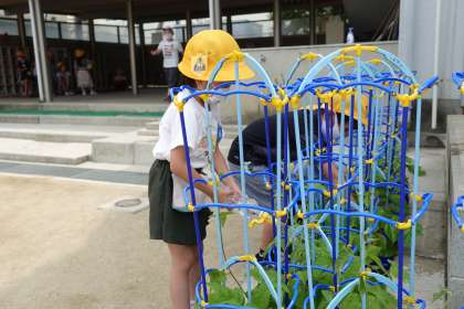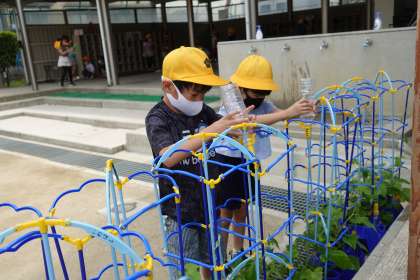 その2です。1年生が朝顔に水やりをしています。