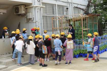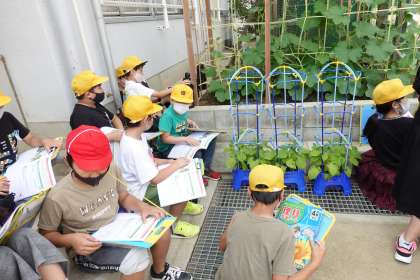 4年1組です。理科の授業で、「ひょうたん」の観察をしています。