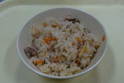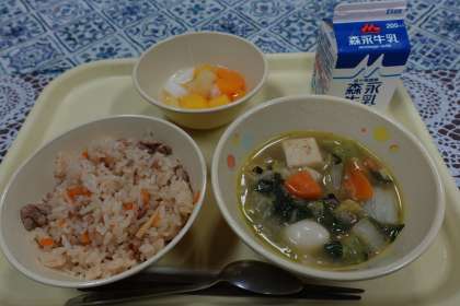 今日の献立は、青菜のサッパリ炒め、中華風かやくご飯、杏仁豆腐、牛乳です。チンゲン菜が主役のサッパリ炒めは、かやくご飯と相性のいい味でした。中華風かやくご飯もおいしかったです。