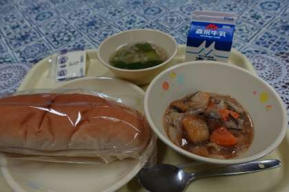 今日の献立は、チンゲン菜のスープ、魚のオイスターソース、コッペパン、ソフトチーズ、牛乳です。今日の魚のオイスターソースは「ホキ」という魚を使っているそうです。あっさりとうまみがあり、とてもおいしかったです。