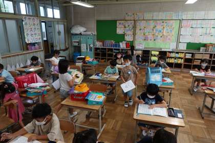 朝の準備をする1年2組です。(1組は更衣中でした)