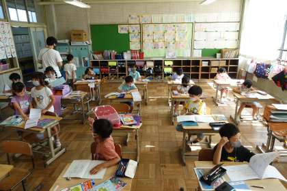 写真は朝の準備をする1年2組です。(1年1組は更衣中でした。)