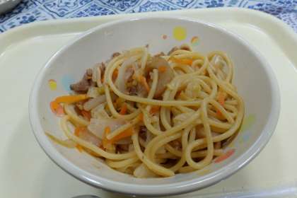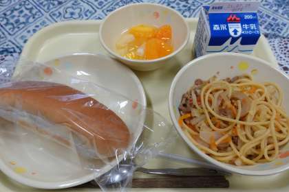 今日の献立は、焼きスパゲティ、ベビーパン、フルーツカクテル、牛乳です。給食では、中華そばを炒めて温度を上げようとすると焦げてしまうため、ゆでたてのスパゲティを使うそうです。ソースの風味が食欲をそそります。