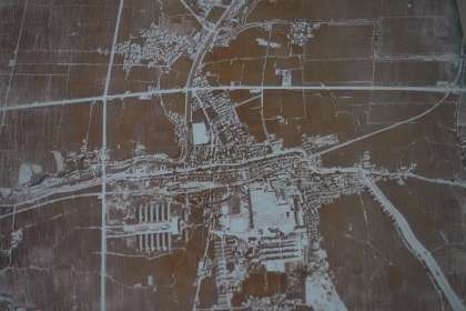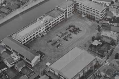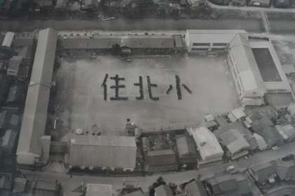 校長室にある古い写真です。一番上の写真が昭和38年ごろの住北小、中央が昭和55年ごろの住北小です。一番下は昭和22年ごろの航空写真です。とても貴重な写真です。