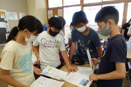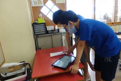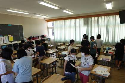 6年2組です。自分が調べたことや考え方を、お互い交流しあって深めています。