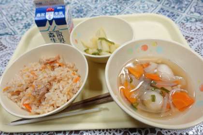 今日の献立は中華スープ、豚キムチご飯、じゃがいもソテー、牛乳です。おいしくいただきました。