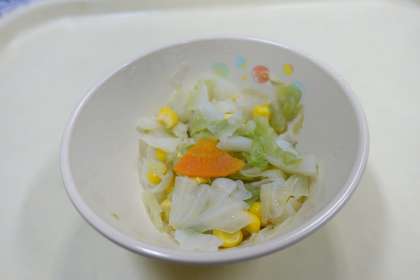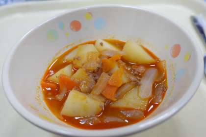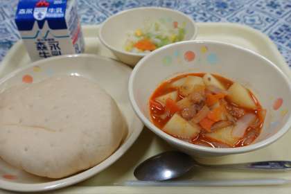 今日の献立は、ポテトのミートソース煮、洋風野菜炒め、オリーブパン、牛乳です。