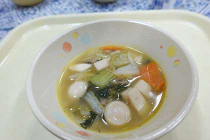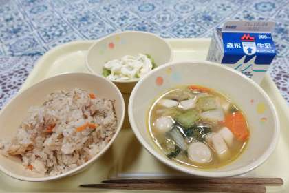 今日の献立は、クファジューシー、青菜のサッパリ炒め、枝豆ポテト、ノンエッグマヨ、牛乳です。クファジューシーは、沖縄県の郷土料理で、沖縄風炊き込みご飯です。「ジューシー」とは、豚肉を使った炊き込みご飯のことだそうです。