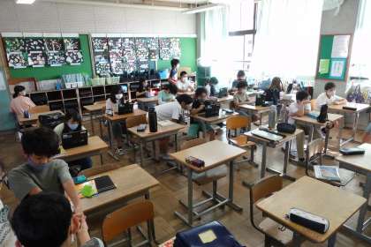 タブレットを使って朝の健康チェックを行い、担任に提出しています。