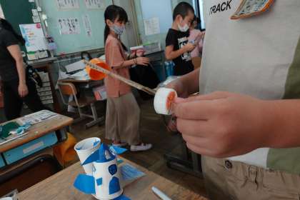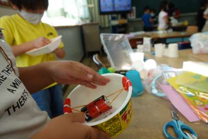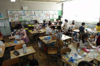 2年1組です。図工で「うごくおもちゃ」を作っています。自慢のおもちゃを色々見せてくれました。上手に作っていますね。
