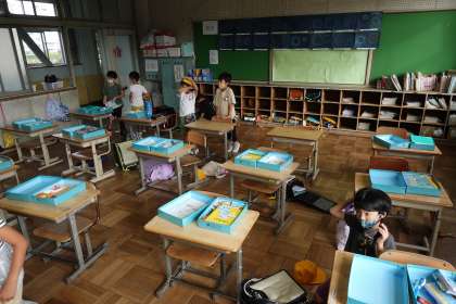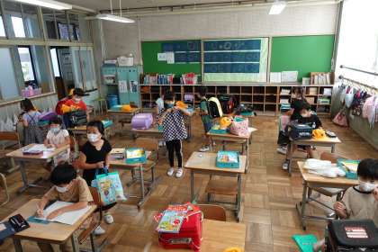 写真は朝の準備をする1年生です。