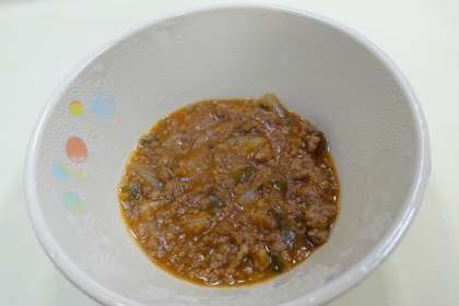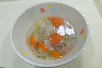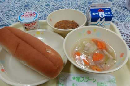 今日の献立は、ミートサンド、コッペパン、野菜スープ、ヨーグルト、牛乳です。