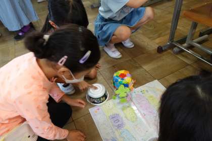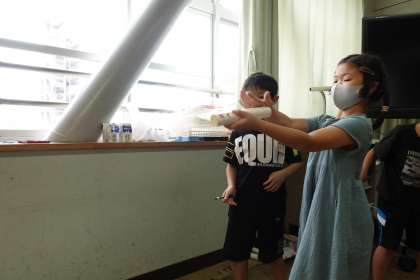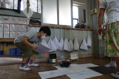 2年生です。図工の時間に作った「動くおもちゃ」で遊んでいます。
