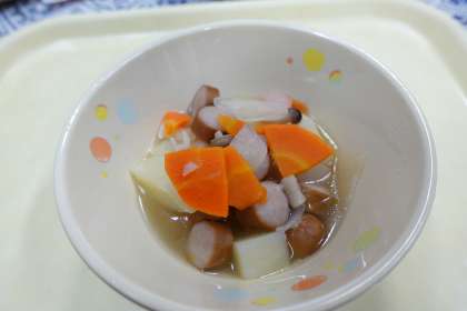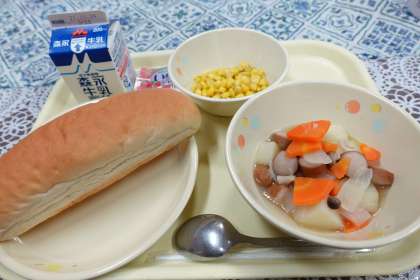 今日の献立は、ポトフ、バターコーン、コッペパン、イチゴジャム、牛乳です。
