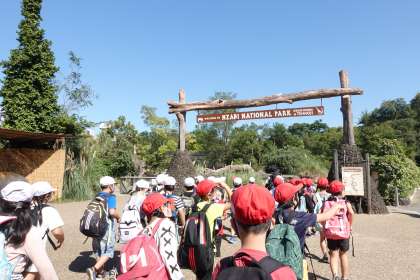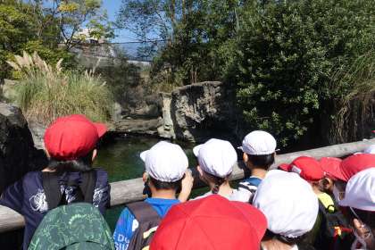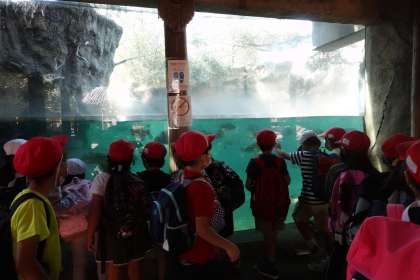 カバ舎を見学しますが、カバは水中にいて見えません。