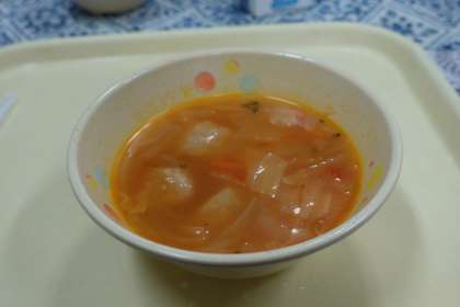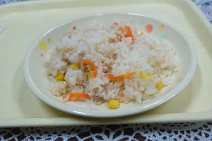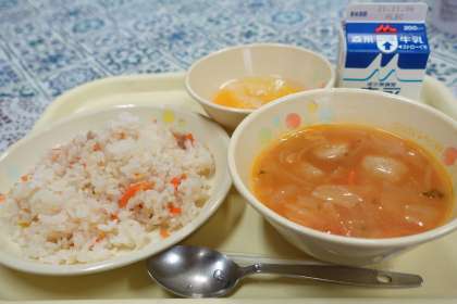 今日の献立は、ツナコーンライス、トマトミートボールスープ、フルーツミックス、牛乳です。
