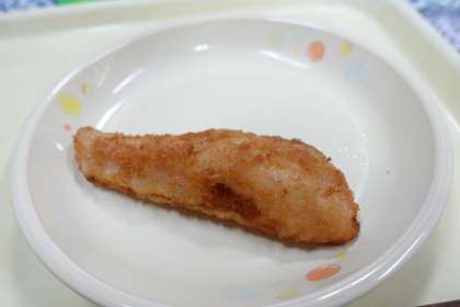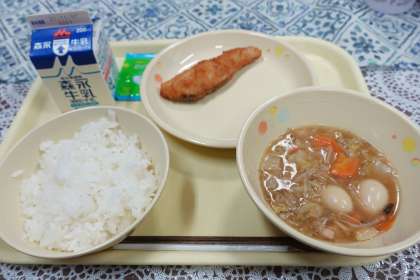 今日の献立は、鮭フライ、鶏肉の中華炒め、ご飯、ふりかけ、牛乳です。