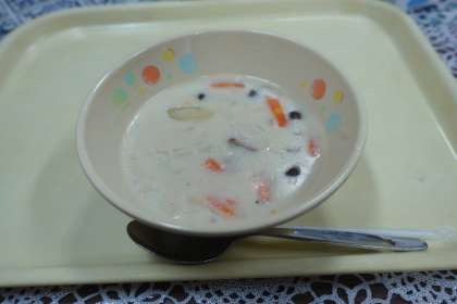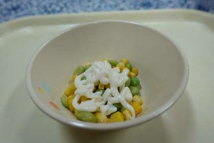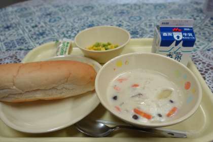 今日の献立は、鮭のクリーム煮、枝豆コーン、コッペパン、ノンエッグマヨネーズ、牛乳です。
