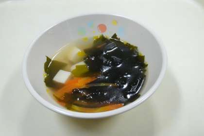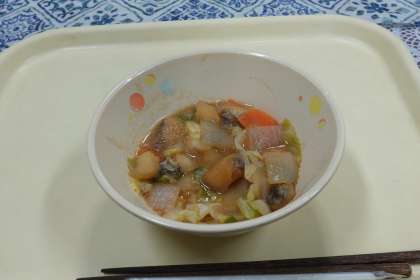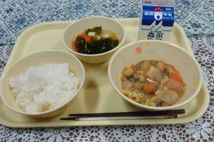 今日の献立は、白身魚のみそ炒め、わかめスープ、ご飯、牛乳です。