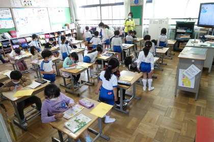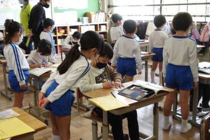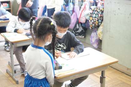 今日は住道こども園さんの園児と交流会です。コロナ禍で、児童と園児が一緒に遊んで交流をする活動も今はできず、今年度も授業を見学してもらいました。