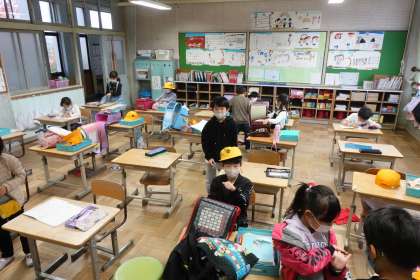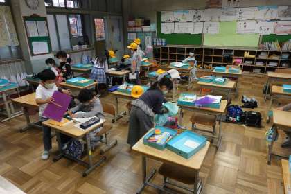写真は朝の準備をする1年生です。