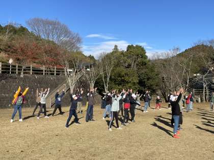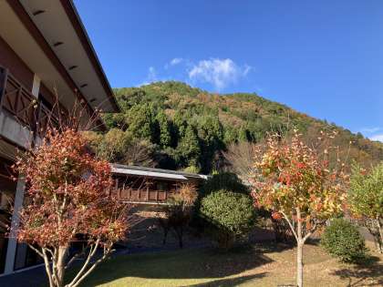 山の木々が美しく紅葉しており、気分はとても晴れやかです。朝の新鮮な空気をしっかり吸い込んで、大きく体を動かしましょう。