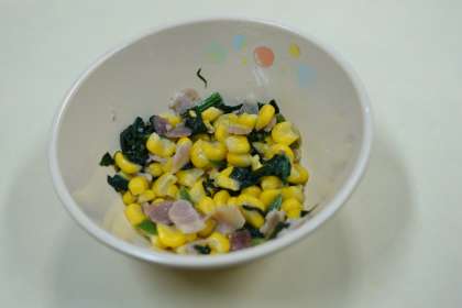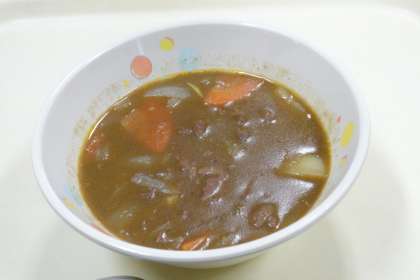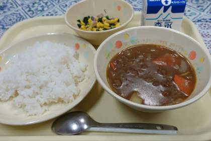 今日はカレーシチュー、ご飯、コーンソテー、牛乳です。