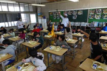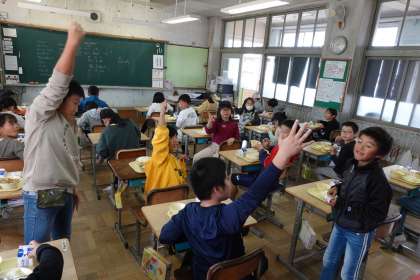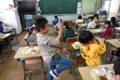 4年1組です。カレーシチューの争奪戦が始まりました。