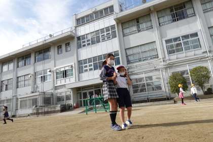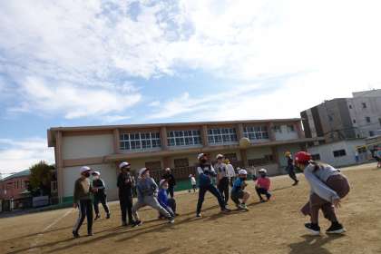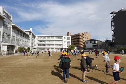 休み時間のグラウンドを撮影しました。5年生が1年生と遊んでくれていました。優しいですね。